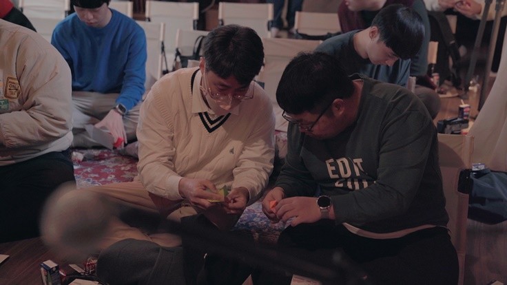 미리 공지된 드레스코드를 살펴보며 다 같이 베스트 드레스를 꼽기도 하고, 집 모양으로 종이 엽서를 접어 새벽공방에게 메시지를 남기는 이벤트도 진행했는데요. 공연 시작 전 가이드를 참고하며 열심히 종이를 접는 관객들의 모습은 '우리집 음악회'에서만 볼 수 있는 귀여운 풍경이었습니다. 공연 중 진행된 엽서 뽑기 이벤트에서 미완성된 집들이 나와 모두에게 웃음을 선사하기도 했답니다.
