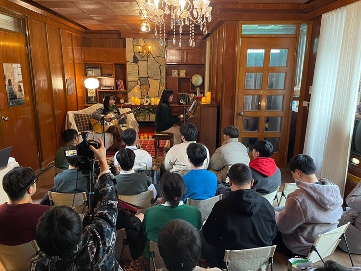 효성 : 방 안을 비추는 노란 조명과, 갈색 목제 가구들, 포근한 향기의 디퓨저까지 어우지러며 따스한 분위기가 가득한 공연장이었어요. 그 공간에 새벽공방의 노래까지 감싸지니.. 몸이 정말 사르르 녹는 기분이었답니다!!