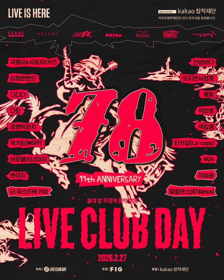 지난 11년 동안 라이브클럽데이는 매달 마지막 주 금요일, 단 한 장의 티켓(프리패스 팔찌)으로 홍대 곳곳의 라이브 클럽을 자유롭게 탐험하는 독특한 문화를 정착시켰습니다. 록의 거친 사운드부터 재즈의 부드러운 선율, 힙합의 비트까지. 누군가에게는 인생 아티스트를 처음 만난 장소로, 누군가에게는 일상의 스트레스를 쏟아내는 해방구로 존재해 왔습니다. 11주년을 맞은 이번 2월은 그 어느 때보다 뜨거운 라인업으로 그 역사를 기념하려 합니다.